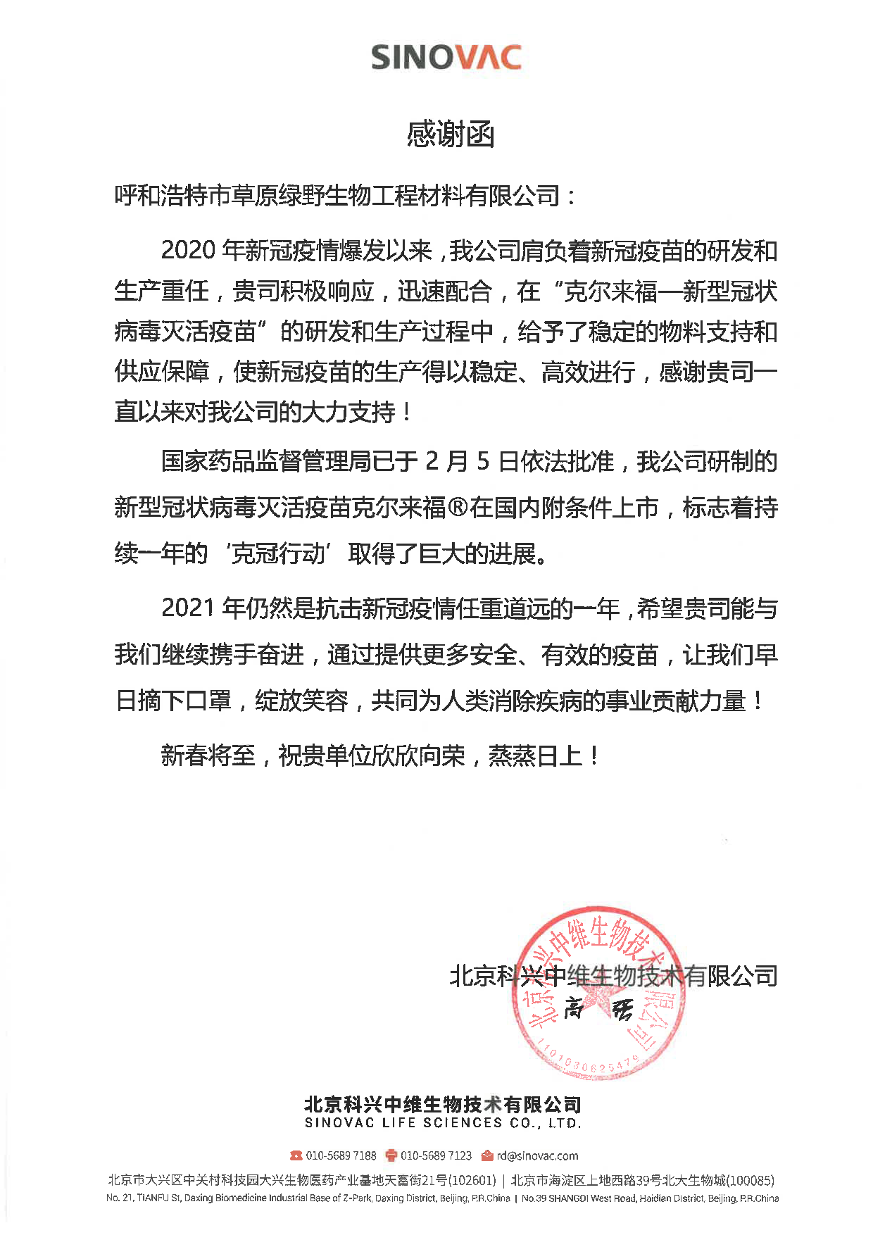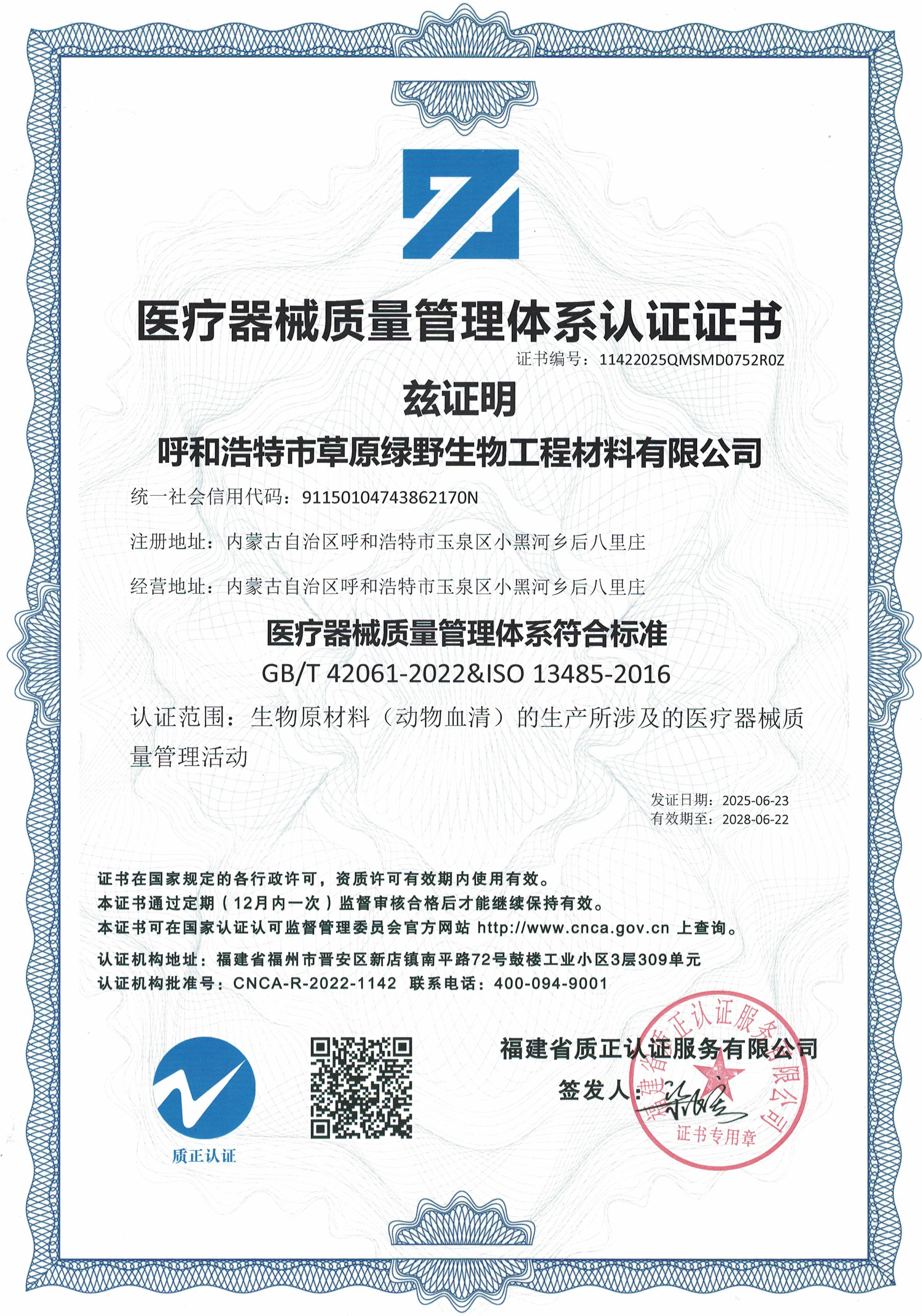 呼和浩特市草原綠野生物工程材料有限公司成立于1984年5月(前身為山西省宏偉血清廠),40余年匠心專注動物血清、培養(yǎng)基、生物制品研發(fā)、生產、銷售和服務為一體的國家高新技術企業(yè)、重點龍頭企業(yè)、專精特新企業(yè)、科技型企業(yè)、企業(yè)研究開發(fā)中心、創(chuàng)新型中小企業(yè)等。