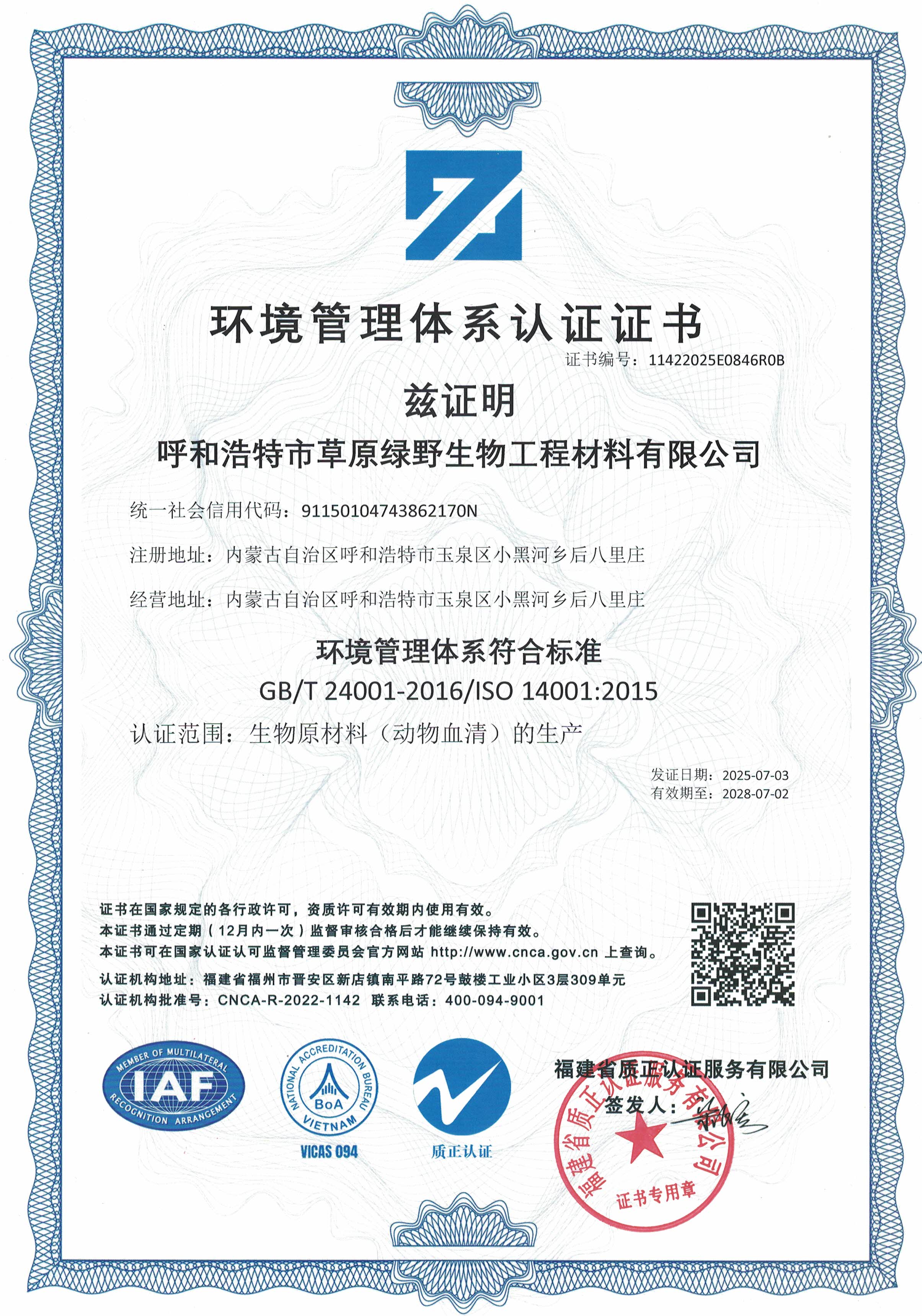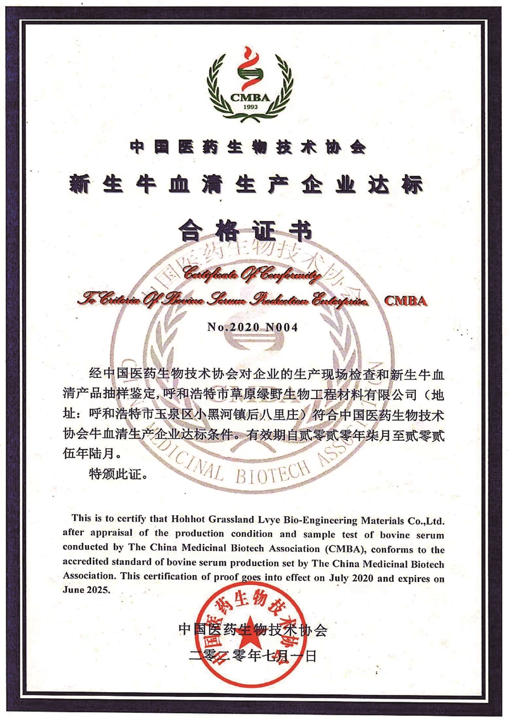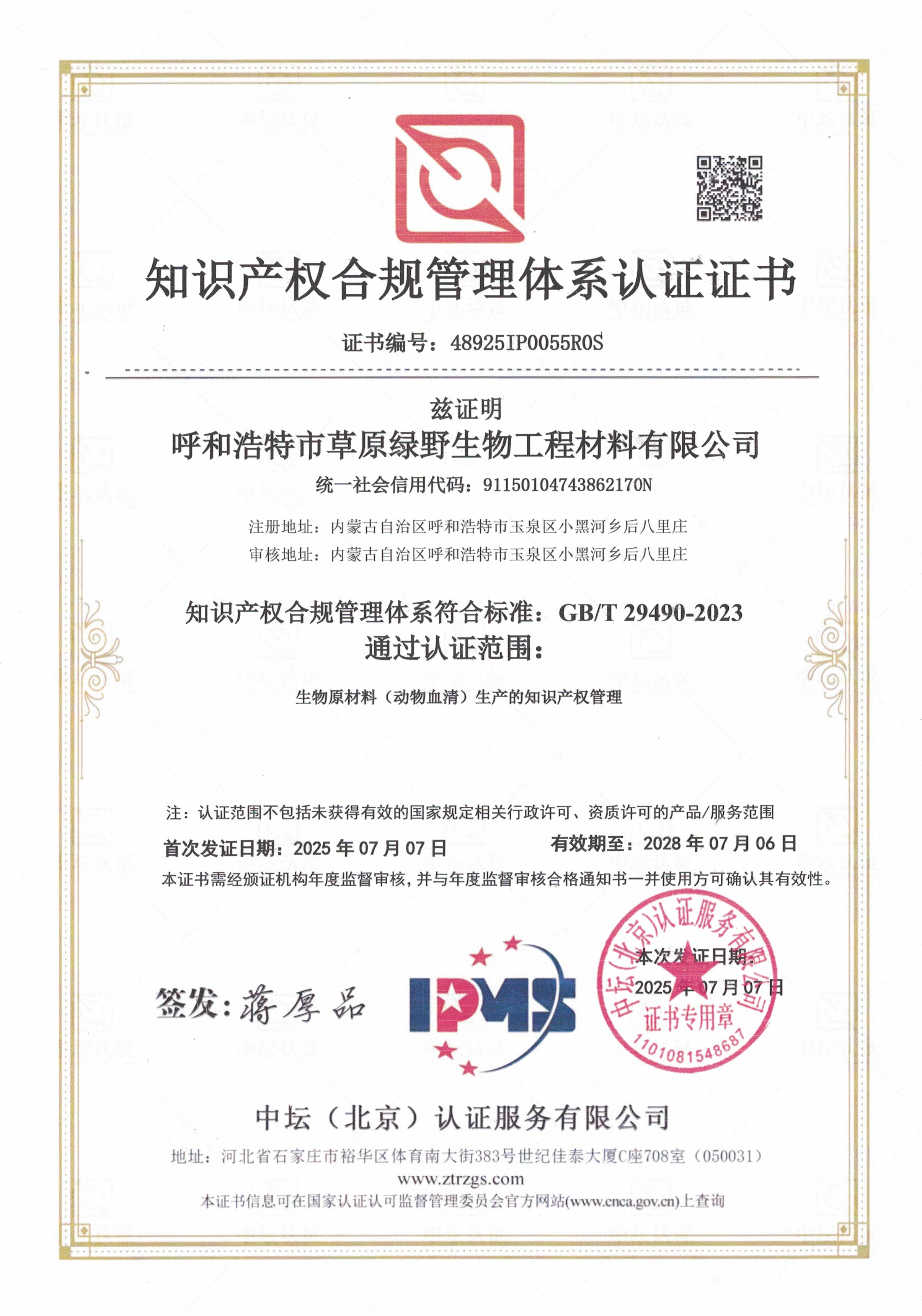 公司至今已多次通過中國醫(yī)藥生物技術協(xié)會《牛血清生產企業(yè)達標》認證、《牛血清生產質量達標企業(yè)》認證。ISO9001質量管理體系認證、ISO45001職業(yè)健康安全管理體系認證、ISO14001環(huán)境管理體系認證、ISO13485醫(yī)療器械質量管理體系認證、ISO50001能源管理體系認證、GB/T29490知識產權合規(guī)管理體系認證、AAA級信用企業(yè)認證、A級納稅單位評審等。